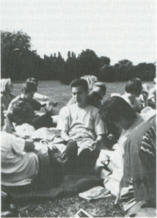 Die ersten Gedanken waren "so ein Mist, jetzt rächen sie sich", "super, Unkraut jähten" oder einfach nur "scheiß Maloche !!!". Doch dann kam die Idee; wir konnten uns ein PRIMA LEBEN an diesem Morgen machen UND gleichzeitig SPAREN! Das Ärgerliche war nur, daß es unseren Lehrern mal wieder nicht an Organisationstalent gefehlt hatte und die einzelnen Klassen pingelig genau zu verschiedenen Arbeiten eingeteilt worden waren, sprich Regale zusammen- bzw. auseinanderbauen, Unkraut jähten (auf dem Schuldach), Tiefgarage säubern oder Bücher ordnen und auflisten. Spätestens jetzt sehen wir ein, daß diese wichtigen Arbeiten notwendigst von uns erledigt werden mußten, um die Schule weiterhin existenzfähig zu halten. Wir pflichtbewußten Schüler trugen zusätzlich und freiwillig zu einer unentgeltlichen Schulverschönerung bei; wir säten auf dem Dach wunderhübsche Stiefmütterchen und vor der Schule einen Schriftzug (ABI ´94) aus. [...] Zum krönenden Abschluß wurde natürlich vor der Schule ein Pique-Nique veranstaltet, bei dem wieder alle auf ihre Kosten kamen (diesmal ohne Folgen).