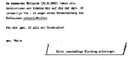 Eines wunderschönen sonnigen Schulmorgens, an dem wir uns alle auf einen unterrichtsfreien Tag freuten, da das Lehrerkollegium den alljährlichen Ausflug genießen würde, wurden wir durch einen Blick ans 'schwarze Brett' eines Besseren belehrt. Dort pinnte dieser Zettel: